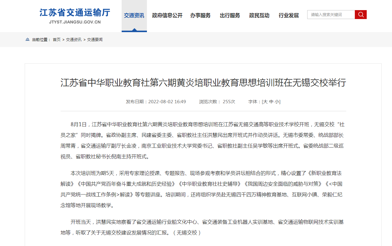 江蘇省交通運(yùn)輸廳:江蘇省中華職業(yè)教育社第六期黃炎培職業(yè)教育思想培訓(xùn)班在無錫交校舉行
