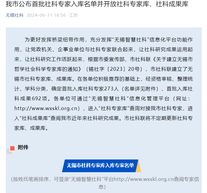 此次專家遴選入庫活動自2023年10月開始籌辦,由無錫市委宣傳部、市社會科學(xué)界聯(lián)合會組織。在各單位推薦的基礎(chǔ)上,經(jīng)資格審核、整理統(tǒng)計、學(xué)科分類,專家評審,最終確定首批入庫社科專家273人。
