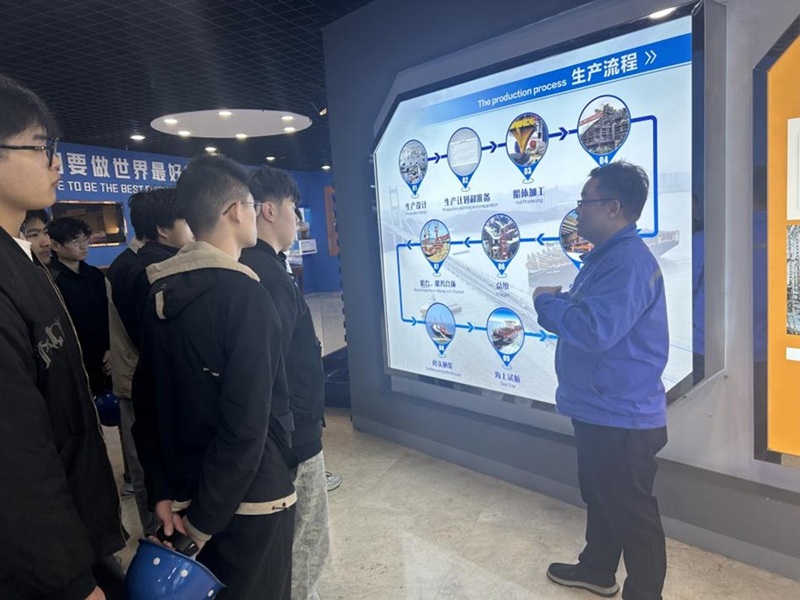 在企業(yè)專家的帶領(lǐng)下,我校師生首先參觀了廠區(qū)船塢、船臺及各個車間,直觀學(xué)習(xí)到了各個船舶分段,并了解目前企業(yè)主要在建船型,使學(xué)生深刻學(xué)習(xí)到了造船流程。隨后,學(xué)生們登上了一艘5萬噸成品油船,參觀了機(jī)艙、甲板、駕駛臺等區(qū)域。企業(yè)專家非常細(xì)致地給學(xué)生講解了主機(jī)、發(fā)電機(jī)、鍋爐、制冷裝置、軸系等重要的機(jī)艙設(shè)備,并介紹了部分技術(shù)非常先進(jìn)的新設(shè)備,讓學(xué)生學(xué)習(xí)到了很多在課堂中難以獲取的新知識,拓寬了專業(yè)知識面。最后,企業(yè)專家為我校師生介紹了揚子江集團(tuán)的企業(yè)文化、已建造的典型船舶、企業(yè)發(fā)展愿景等。企業(yè)方表示,后續(xù)將進(jìn)一步加強(qiáng)和我校的合作,共育高素質(zhì)船業(yè)人才。