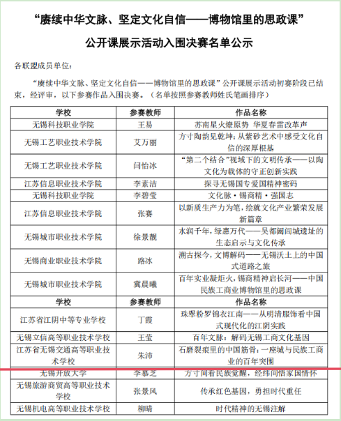 近日,馬克思主義學(xué)院組織教師參加了無錫市教育局等三部門開展的“賡續(xù)中華文脈、堅定文化自信——博物館里的思政課”公開課展示活動。5月20日,官方公示了初賽結(jié)果,朱沛老師的作品《石磨裂痕里的中國筋骨:一座城與民族工商業(yè)的百年突圍》入圍決賽。