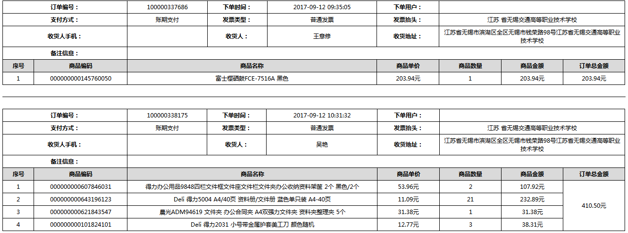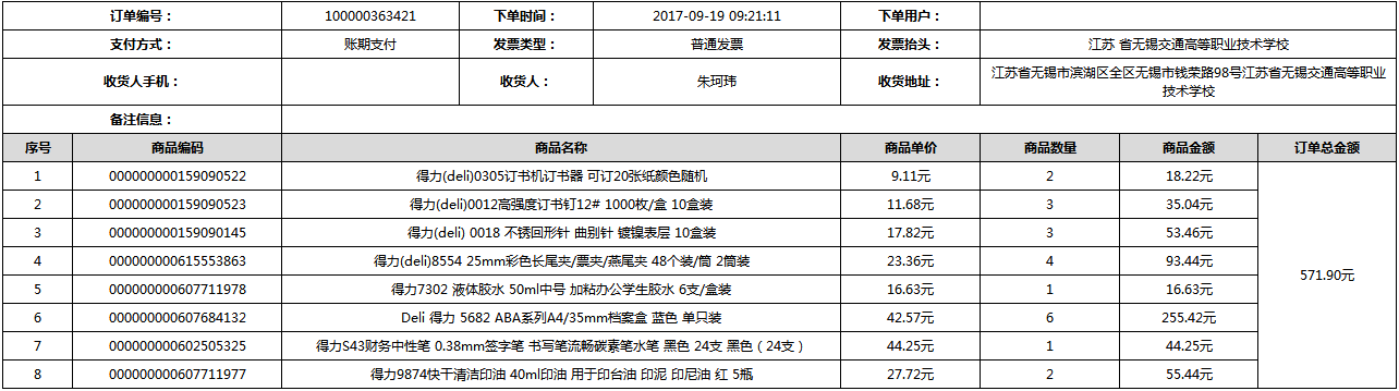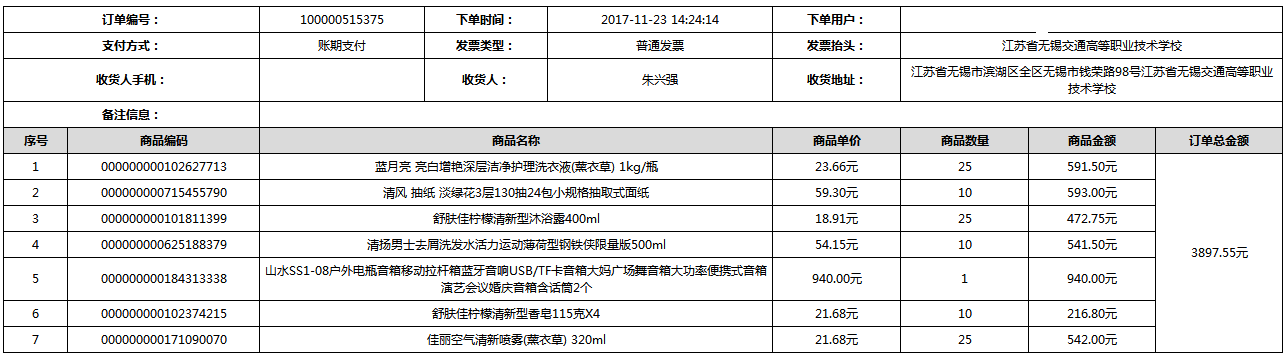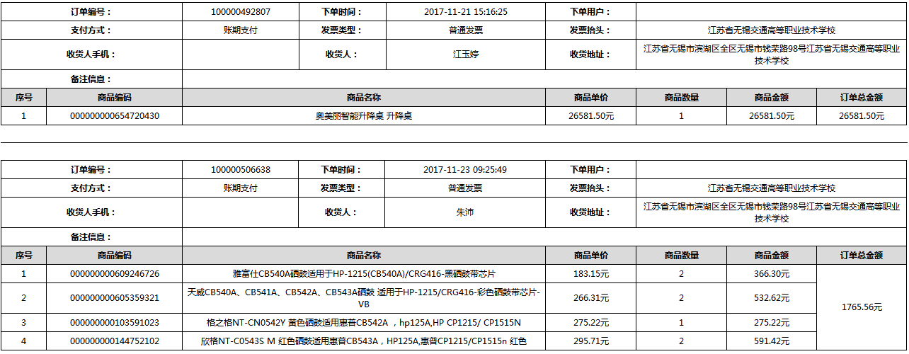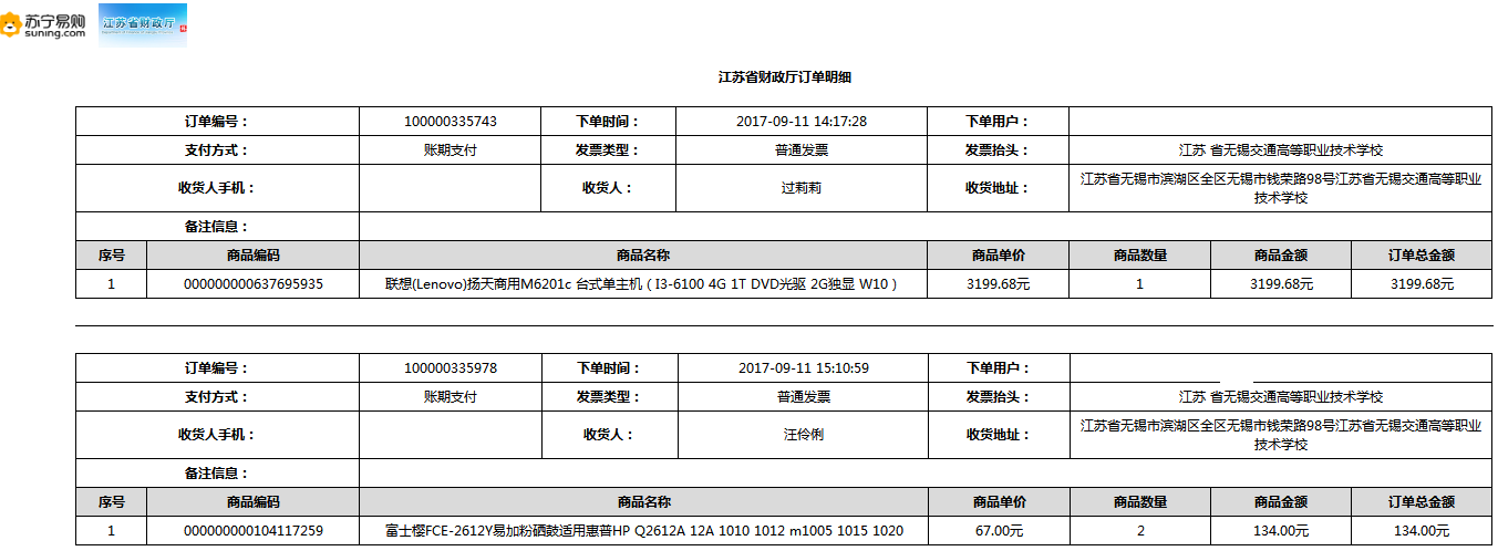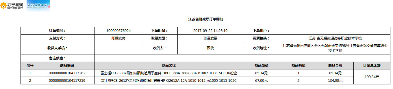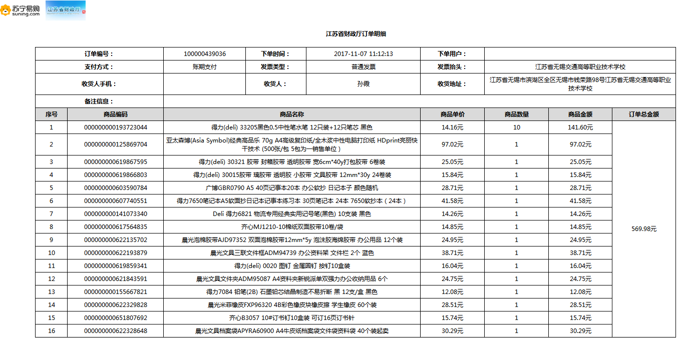 根據(jù)江蘇省財政廳政府采購《關(guān)于在省級預算單位實行網(wǎng)上商城采購的通知》蘇財購(2015)45號、《江蘇省省級政府采購網(wǎng)上商城管理暫行辦法》蘇財購〔2015〕48號、《關(guān)于網(wǎng)上商城采購有關(guān)事項的補充通知 》蘇財購〔2016〕18號、《關(guān)于推廣江蘇省省級政府采購網(wǎng)上商城采購有關(guān)工作的通知 》蘇財辦〔2016〕42號相關(guān)文件精神,建立江蘇省省級政府采購網(wǎng)上商城專屬采購平臺。結(jié)合《關(guān)于省級“網(wǎng)上商城”支付方式的政策說明》及我校實際。依據(jù)《轉(zhuǎn)發(fā)財政部關(guān)于進一步做好政府采購信息公開工作有關(guān)事項的通知》蘇財購[2017]50號現(xiàn)就2017年9月14日-2017年11月27日網(wǎng)上商城采購訂單明細進行公示: