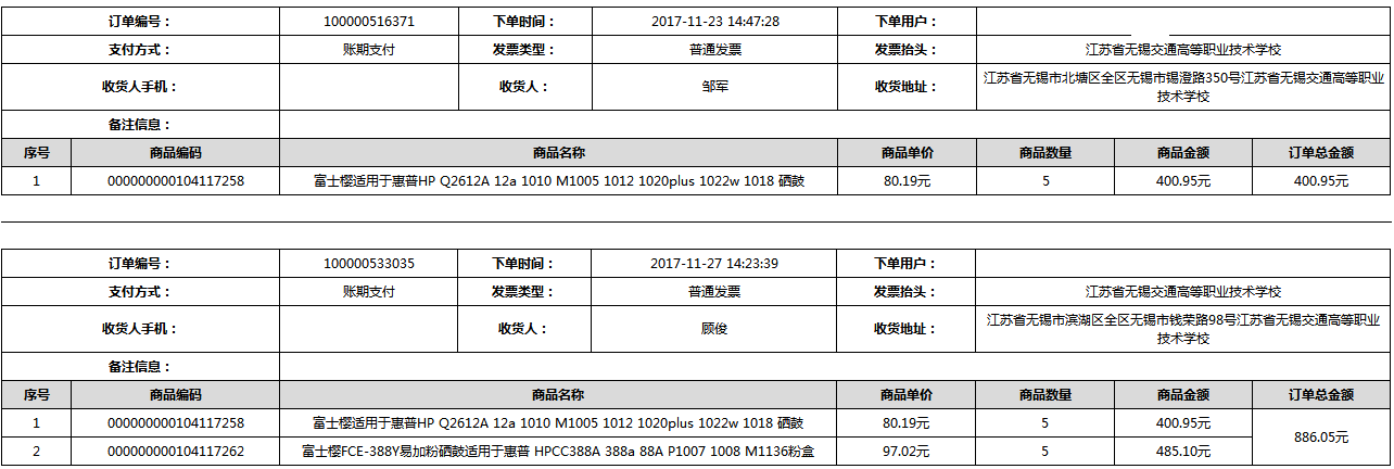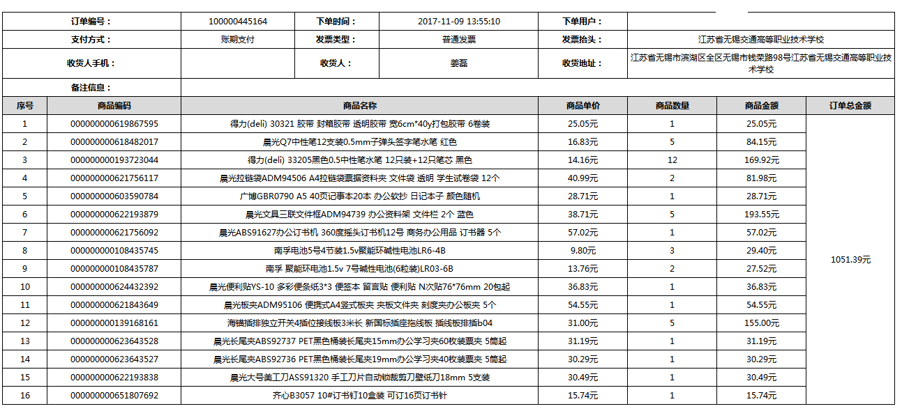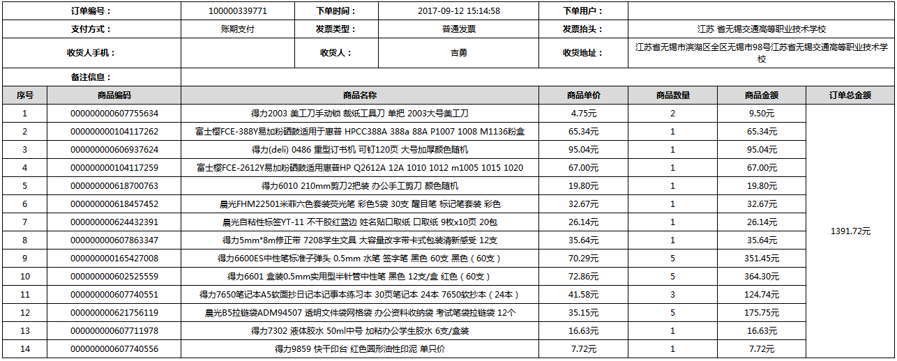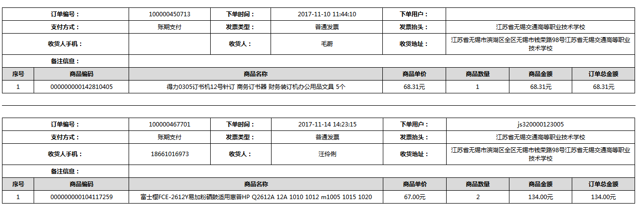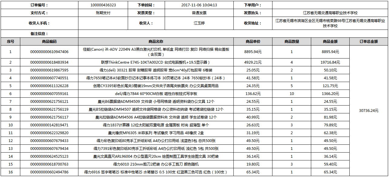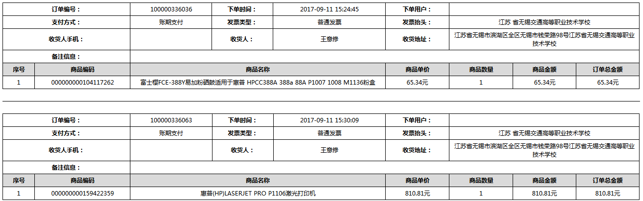 根據(jù)江蘇省財政廳政府采購《關(guān)于在省級預算單位實行網(wǎng)上商城采購的通知》蘇財購(2015)45號、《江蘇省省級政府采購網(wǎng)上商城管理暫行辦法》蘇財購〔2015〕48號、《關(guān)于網(wǎng)上商城采購有關(guān)事項的補充通知 》蘇財購〔2016〕18號、《關(guān)于推廣江蘇省省級政府采購網(wǎng)上商城采購有關(guān)工作的通知 》蘇財辦〔2016〕42號相關(guān)文件精神,建立江蘇省省級政府采購網(wǎng)上商城專屬采購平臺。結(jié)合《關(guān)于省級“網(wǎng)上商城”支付方式的政策說明》及我校實際。依據(jù)《轉(zhuǎn)發(fā)財政部關(guān)于進一步做好政府采購信息公開工作有關(guān)事項的通知》蘇財購[2017]50號現(xiàn)就2017年9月14日-2017年11月27日網(wǎng)上商城采購訂單明細進行公示: