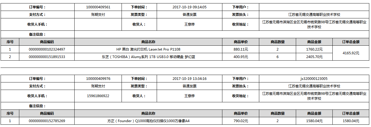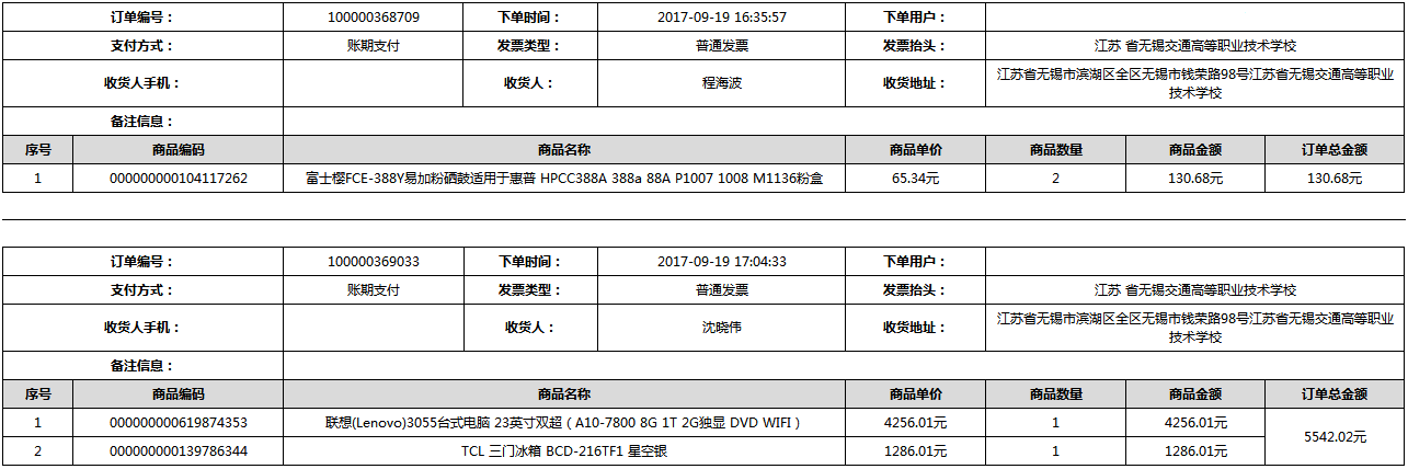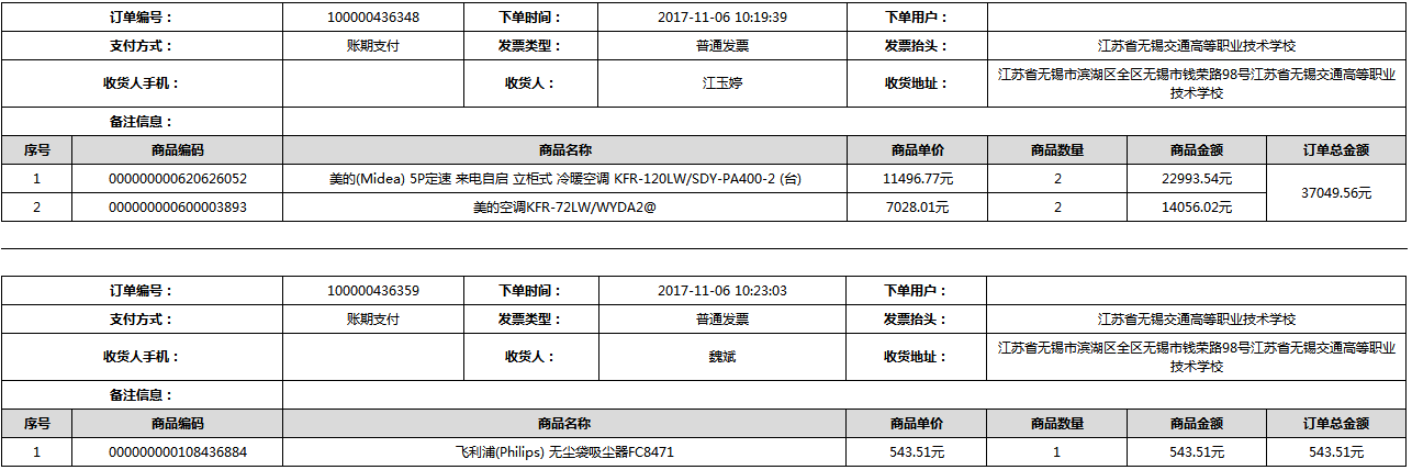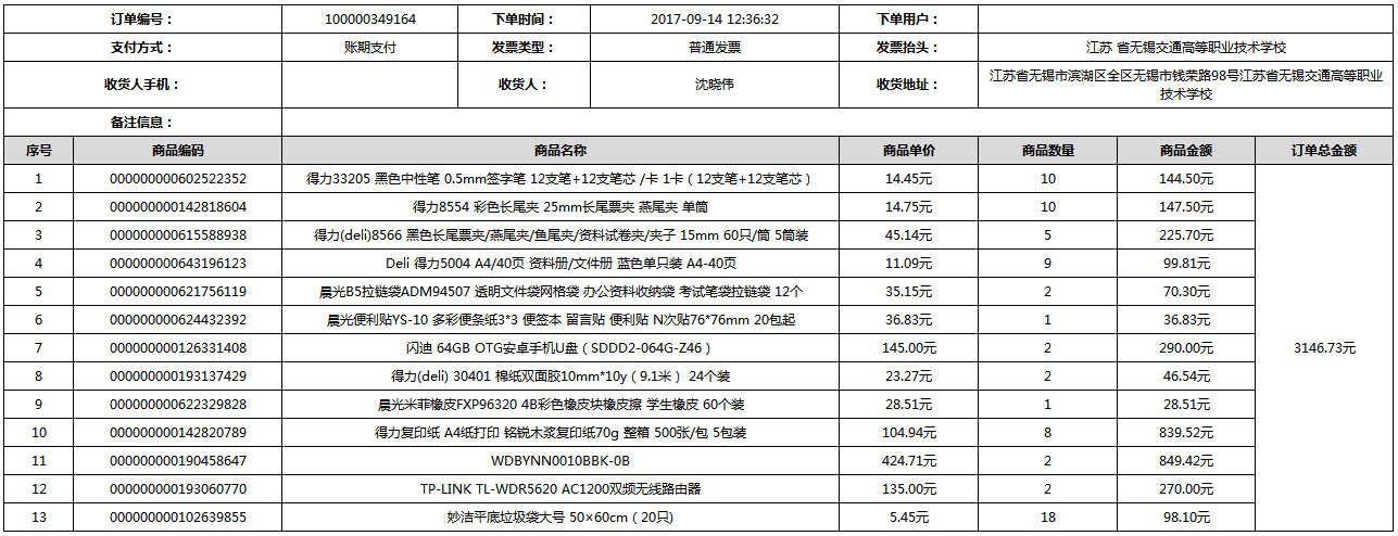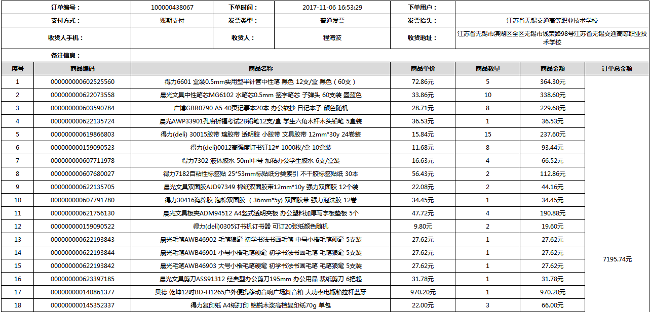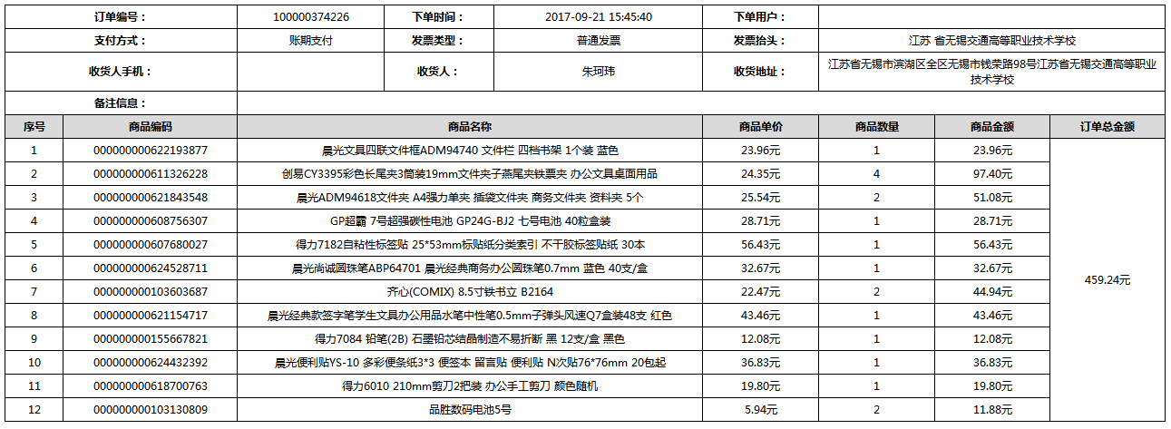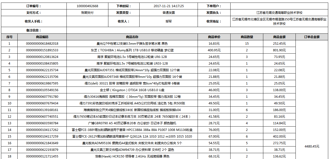 根據(jù)江蘇省財政廳政府采購《關(guān)于在省級預算單位實行網(wǎng)上商城采購的通知》蘇財購(2015)45號、《江蘇省省級政府采購網(wǎng)上商城管理暫行辦法》蘇財購〔2015〕48號、《關(guān)于網(wǎng)上商城采購有關(guān)事項的補充通知 》蘇財購〔2016〕18號、《關(guān)于推廣江蘇省省級政府采購網(wǎng)上商城采購有關(guān)工作的通知 》蘇財辦〔2016〕42號相關(guān)文件精神,建立江蘇省省級政府采購網(wǎng)上商城專屬采購平臺。結(jié)合《關(guān)于省級“網(wǎng)上商城”支付方式的政策說明》及我校實際。依據(jù)《轉(zhuǎn)發(fā)財政部關(guān)于進一步做好政府采購信息公開工作有關(guān)事項的通知》蘇財購[2017]50號現(xiàn)就2017年9月14日-2017年11月27日網(wǎng)上商城采購訂單明細進行公示: