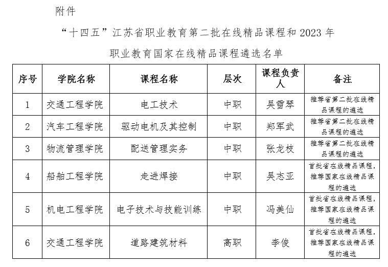 根據(jù)省教育廳《關于做好“十四五”江蘇省職業(yè)教育第二批在線精品課程遴選和2023年職業(yè)教育國家在線精品課程推薦工作的通知》,啟動了國家和省在線精品課程申報。經(jīng)各院部申報、專家評審并報校領導審批,擬推薦《電工技術》等3門課程參加省第二批在線精品課程的遴選?!蹲哌M焊接》等3門課程擬參加國家在線精品課程的遴選?,F(xiàn)予以公示,公示時間:2024年1月18日到2024年1月22日。