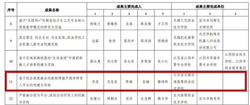 根據(jù)“無錫市教育局關(guān)于公布 2019無錫市教學(xué)成果獎(jiǎng)評(píng)選結(jié)果的通報(bào)”(錫教發(fā)〔2020〕36 號(hào)),評(píng)選出2019年市教學(xué)成果獎(jiǎng)100項(xiàng),其中中等職業(yè)教育類成果11項(xiàng)。我校李虎書記主持的《基于校企深度融合的船舶焊接產(chǎn)教學(xué)研育人平臺(tái)的構(gòu)建與實(shí)踐》,榮獲2019年無錫市教學(xué)成果獎(jiǎng)一等獎(jiǎng)。